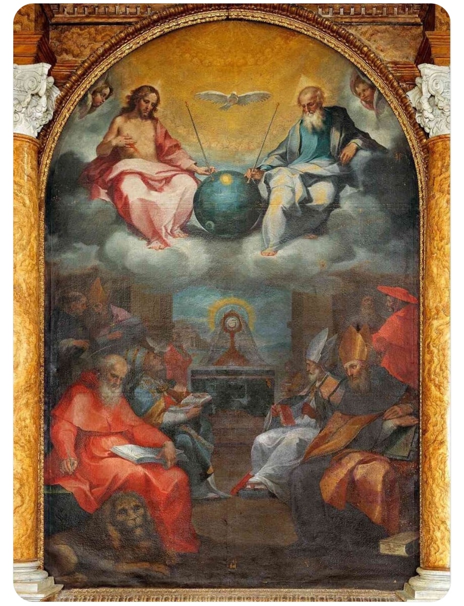 Картина Прославление Евхаристии, также известная как Диспут о Евхаристии, была заказана для церкви Святого Петра в Монтальчино и закончена примерно в 1600 году. Сюжет полотна разделен на две части: земную и небесную. Внизу мы видим святых и праведников, сгруппированных вокруг алтаря с дароносицей. Это традиционная сцена поклонения святым дарам. Но все самое интересное происходит наверху, в облаках.