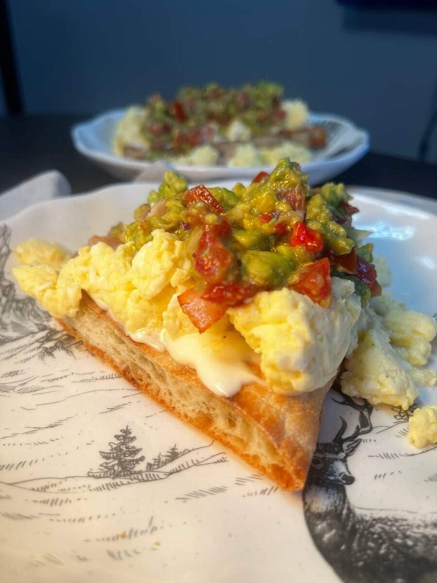 • На хлеб выкладываем болтунью, бекон и сверху — авокадо с помидором.
