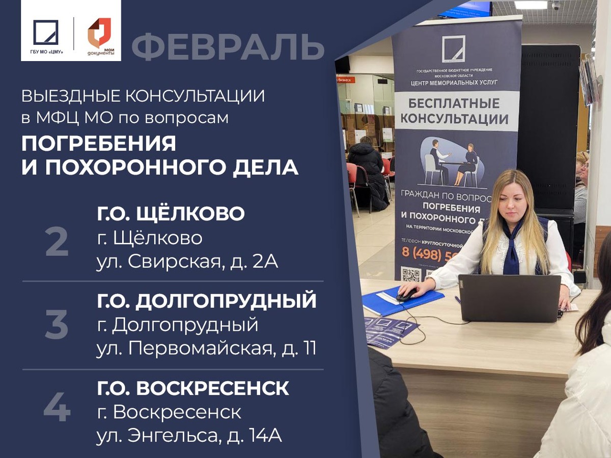Воспользуйтесь бесплатной консультацией и получите необходимую информацию о том, как оформить место захоронения, как оформить разрешение на установку или замену надмогильных сооружений, ограждений, как получить место для создания семейного (родового) захоронения и по другим вопросам сферы погребения и похоронного дела. 02.02.2026 Московская обл., г.о. Щёлково, г. Щёлково, ул. Свирская, д. 2А 03.02.2026 Московская обл., г.о. Долгопрудный, г. Долгопрудный, ул. Первомайская, д. 11 04.02.2026 Московская обл., г.о. Воскресенск, г. Воскресенск, ул. Энгельса, д. 14А Также получить бесплатную консультацию в сфере погребения и похоронного дела можно удаленно, обратившись на круглосуточную горячую линию ГБУ МО "ЦМУ" по номеру телефона 8 (498) 568-99-99 Анонсы выездных консультаций можно найти на наших официальных страницах в социальных сетях: Telegram: https://t.me/memorial_mo Одноклассники: https://ok.ru/memorialmo Дзен: https://dzen.ru/memorialmo ВК: https://vk.com/memorial_mo