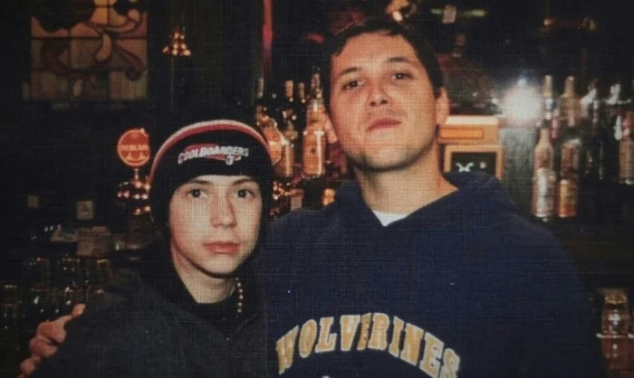 На этом архивном снимке запечатлен поворотный момент в истории российского хип-хопа, когда жанр только начинал свой стремительный взлет к вершинам чартов. Юный Кирилл Толмацкий, известный всей стране как Децл, стоит рядом со своим наставником и продюсером Владом Валовым, также известным как ШЕFF. Их образы идеально передают дух конца девяностых: широкая одежда, характерные жесты и дерзкий взгляд, устремленный в будущее. Именно в этом, 1999 году, начинается активная работа над дебютным материалом, который вскоре зазвучит из каждого окна и автомобиля. Фотография буквально пропитана энергией молодости и больших амбиций, предвещая скорый выход культового альбома «Кто? ты».