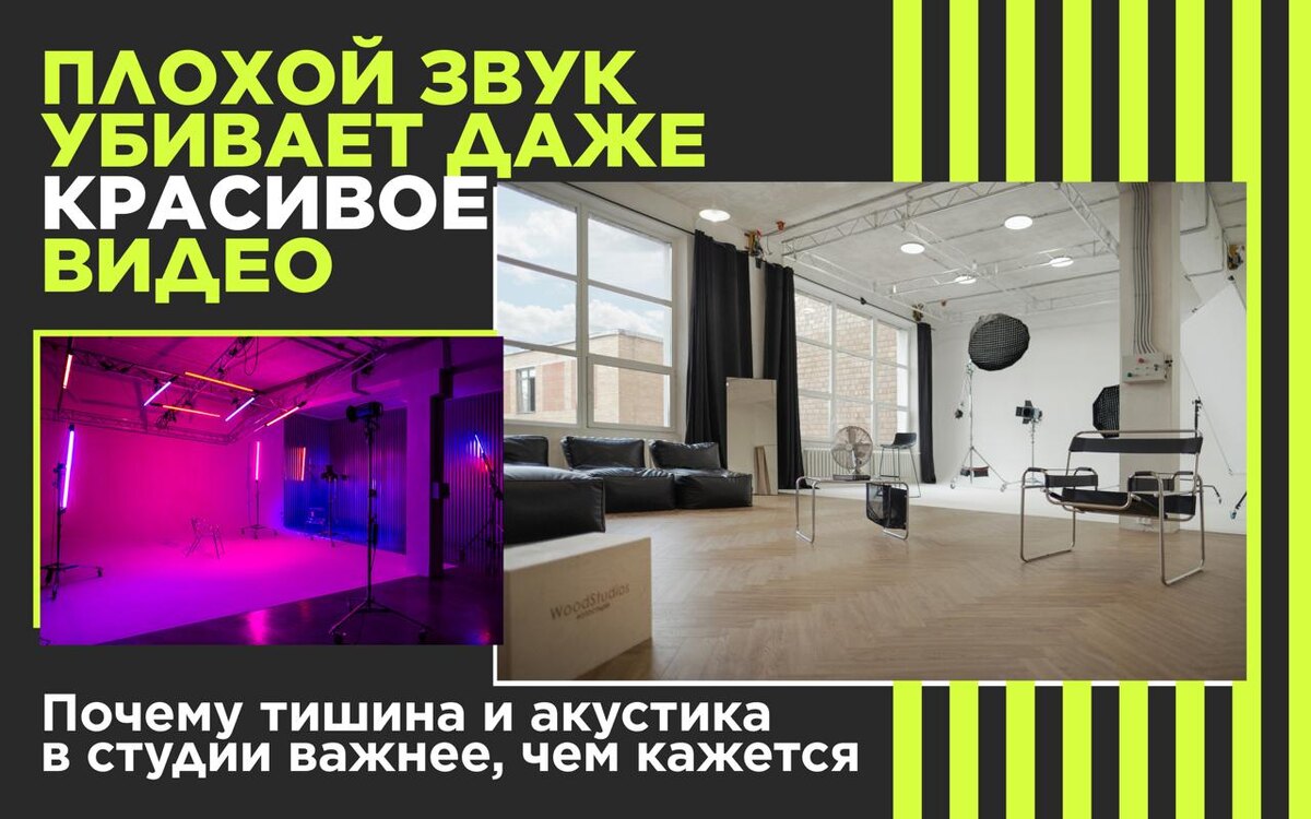 Можно идеально выстроить кадр. Красивый свет, чистый фон, дорогая камера. Но если в записи слышно эхо, гул или посторонние шумы, видео перестают смотреть. Просто потому, что слушать неприятно. Звук - это половина впечатления, хотя о нём чаще всего думают в последнюю очередь. Кажется, что главное картинка, а остальное «поправим потом». На практике всё наоборот: плохой звук не чинится монтажом. Его можно приглушить, но нельзя сделать по-настоящему чистым, если изначально условия были не те. Одна из главных проблем студий - внешние шумы. Производства в здании, мастерские, склады, постоянное движение техники. Всё это может быть не видно в кадре, но микрофон слышит абсолютно всё. Мы изначально выбирали пространство без производств и шумных соседей. В здании нет цехов, станков и помещений с постоянным фоновым шумом. Это даёт стабильную тишину, которая особенно важна для видео с живым звуком. Отдельный момент, акустика внутри студии. Когда пространство «звенит», голос становится пустым и