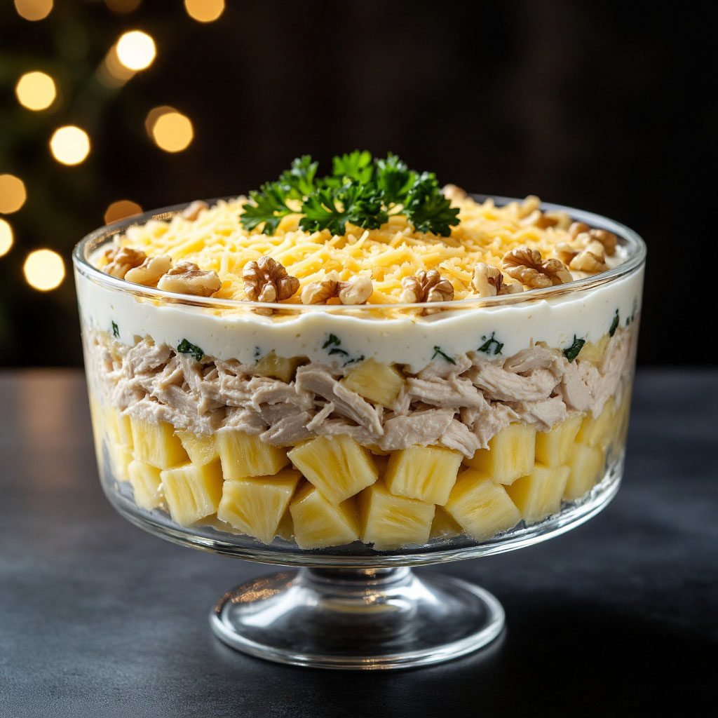 Помню, как сестра готовила его к моему выпускному. В те времена консервированные ананасы были почти деликатесом. Я заворожённо наблюдала, как она аккуратно сливает сироп, а на кухне повисает этот сладковато-тропический аромат, смешиваясь с запахом жареной курицы и грецких орехов. А потом — таинство приготовления чесночного майонеза. «Главное, — говорила она, — чтобы все ингредиенты были идеально сухими, а сырная шапка — равномерной и щедрой». Это было не просто смешивание продуктов, это был ритуал. И вкус... Невероятное сочетание нежной курицы, сочных сладких ананасов, хрустящих орехов и пикантного чесночного крема. Каждая ложка была взрывом праздника. Теперь я продолжаю эту традицию и делюсь с вами рецептом нашего семейного «Царского» салата — блюда, которое превращает любой повод в торжество. ЧТО НАМ ПОНАДОБИТСЯ (королевский набор) Здесь важно качество каждого компонента, особенно курицы и майонеза. ПОШАГОВЫЙ ПЛАН: СОБИРАЕМ ПРАЗДНИК СЛОЯМИ Секрет салата — в слоях и их правильной под