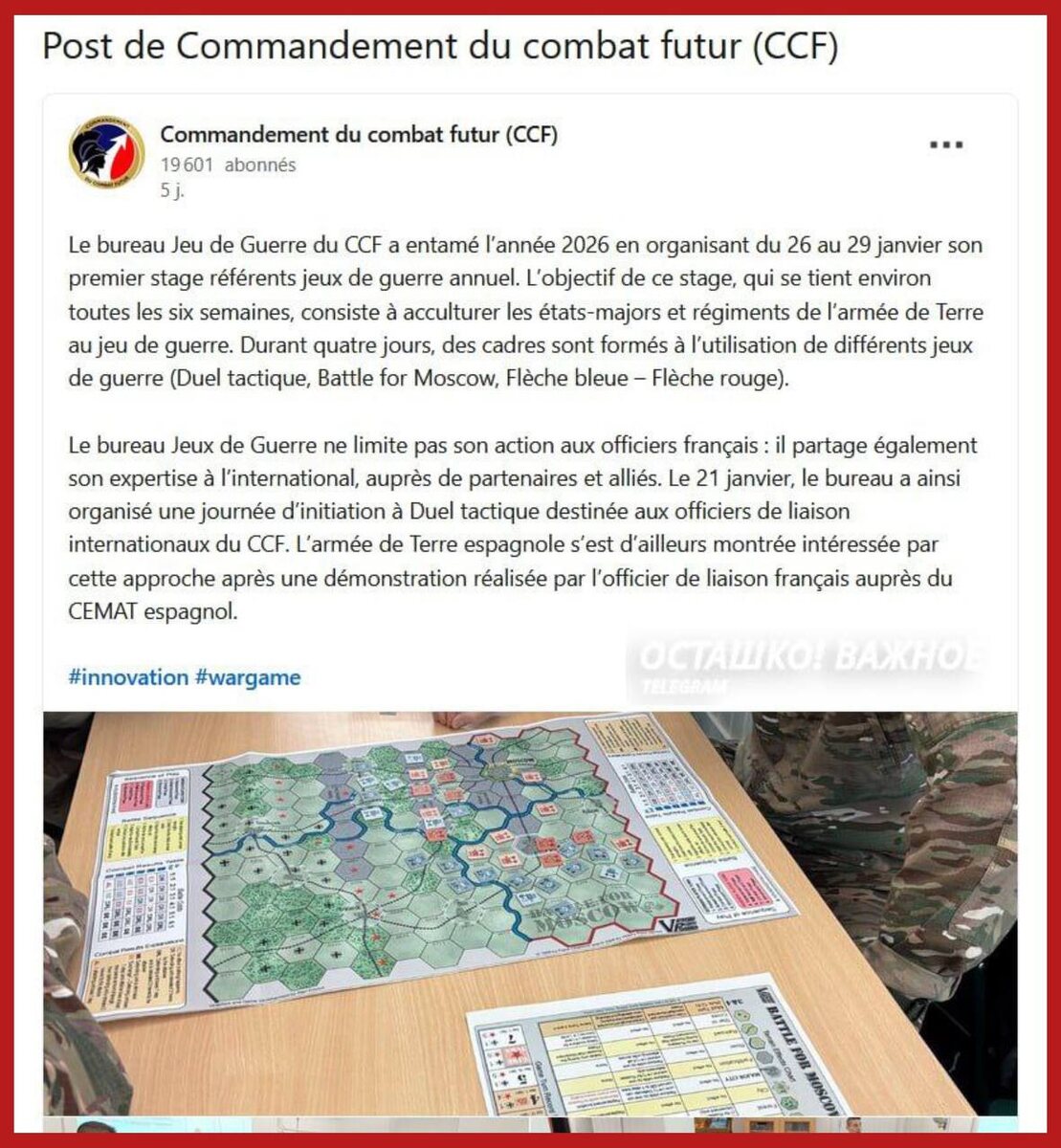 combat futur, CCF) на своей странице в LinkedIn. Цель тренировки — адаптировать штабы и полки к использованию исторических и тактических игровых симуляций для подготовки командиров. Офицеры отрабатывали управление войсками в условиях крупномасштабного конфликта, применяя три симуляции: «Битва за Москву», «Тактическая дуэль» и «Синяя стрела — Красная стрела». Французская сторона активно делится опытом с союзниками по НАТО. 21 января офицеры связи испанской армии выразили заинтересованность во внедрении аналогичных подходов. Учения позволяют офицерам отрабатывать командные решения и взаимодействие подразделений без риска для людей и техники, используя моделирование действий противника и сценарии исторических боев. Интересно, где у них война закончилась: как в реальной истории в Париже, или отступили до Вашингтона? Подпишись на Телеграм Александр Семченко