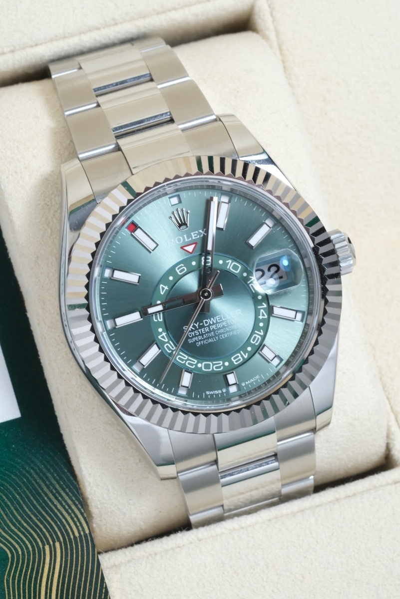 В поступлениях "Мануфактуры" нет случайных позиций: только ведущие часовые и ювелирные дома и лучшая механика. И мы заметили устойчивый тренд: за последние месяцы заметно вырос интерес к сложным механическим часам и знаковым ювелирным изделиям. Sky-Dweller считается одной из самых технически продвинутых моделей в линейке Rolex, и это не маркетинговое преувеличение. Здесь сочетаются сразу две сложные функции, которые действительно полезны в жизни: второй часовой пояс и годовой календарь. При этом всё интуитивно через фирменное вращающееся кольцо без лишних кнопок и усложнений циферблата. Зелёный циферблат завораживает, особенно при естественном освещении. Он не кричащий, но сразу притягивает взгляд, что редко удаётся в рамках классического корпуса Rolex. Механически Sky-Dweller построен на собственном автоматическом калибре Rolex с высокой точностью и стабильностью хода. Годовой календарь автоматически учитывает длину месяцев и требует корректировки всего один раз в год, в конце февраля