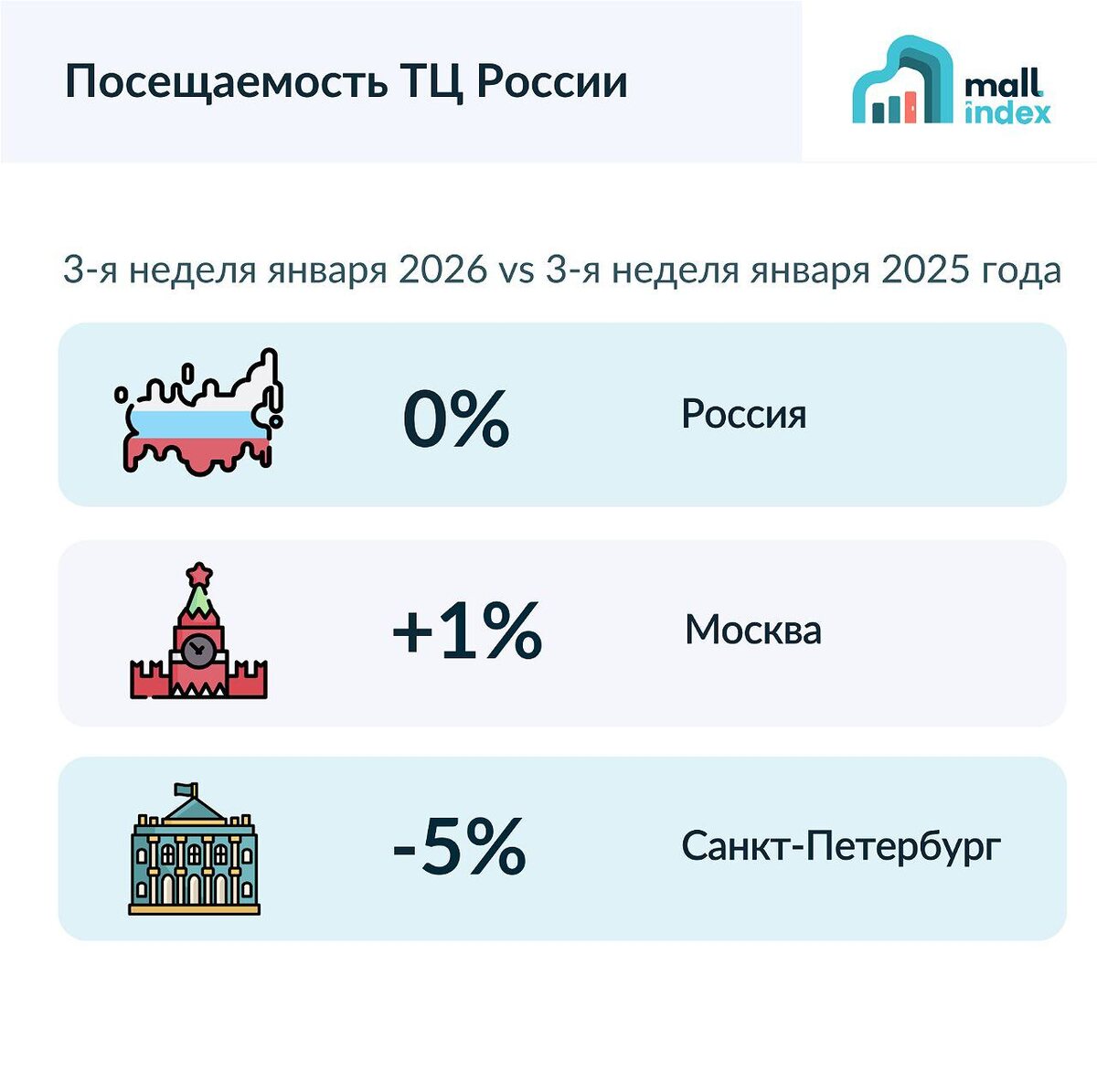 Середина января — период «паузы» в потребительской активности 3-я неделя января 2026 vs 3-я неделя января 2025: 🇷🇺 Россия +0% 🌇 Москва +1% 🏙️ Санкт-Петербург -5% «После праздников рынок возвращается к сезонной норме последних лет. При этом, в сравнении с прошлогодними значениями Москва выглядит чуть более оптимистично, в Санкт-Петербурге снижение выражено сильнее», – Михаил Васильев, Focus Technologies.