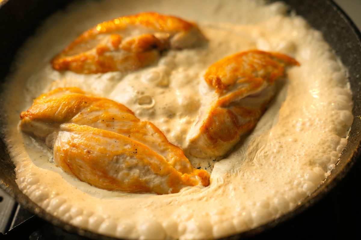 Грудку со сковороды убрать, вместо неё отправить два натертых зубчика чеснока и 200 мл сливок, довести до кипения.