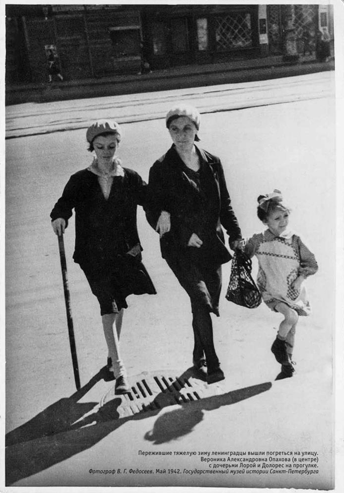 Долорес пытается прыгать и играть, хотя её колени налиты водой от голодных отёков. Этот путь был их ежедневным маршрутом: по улицам Майорова и Герцена, к ДЛТ, на Невский — и обратно. Мать водила их по кругу, лишь бы отвлечь от одной мысли: о еде. Лора незадолго до этого лежала в параличе — от голода отнялась левая половина тела. Врач велела как можно больше ходить. И они ходили. Девочки проявили невероятную силу воли, и, слава богу, с ними была их мама. Они выжили. После войны все вместе работали в Академической капелле на Мойке.