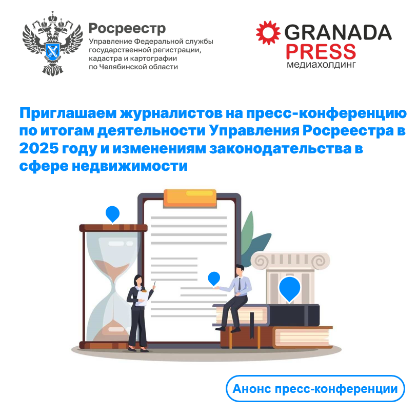 4 февраля 2026 года на площадке медиахолдинга «Гранада Пресс» пройдет большая пресс-конференция Управления Росреестра по Челябинской области по итогам 2025 года и изменениям законодательства в сфере недвижимости. Региональный Росреестр готов поделиться с представителями СМИ статистикой рынка недвижимости, а также детально разъяснить законодательные нововведения 2026 года. Спикерами пресс-конференции станут: Вопросы для обсуждения: Обсудим также формирование земельного банка, мошенничество в сфере недвижимости и использование современных беспилотных летательных аппаратов при осуществлении земельного надзора. Мероприятие для журналистов пройдет в онлайн-формате. Ссылка (https://mcu.gov74.ru/client?conference=74200) для подключения. Приглашаем представителей СМИ принять участие! #РосреестрЧелябинск #ПрессКонференция #ИзмененияЗаконодательства #ИтогиГода #РосреестрРазъясняет #ОльгаСмирных #ОльгаЮрченко #ЕвгенийБабич