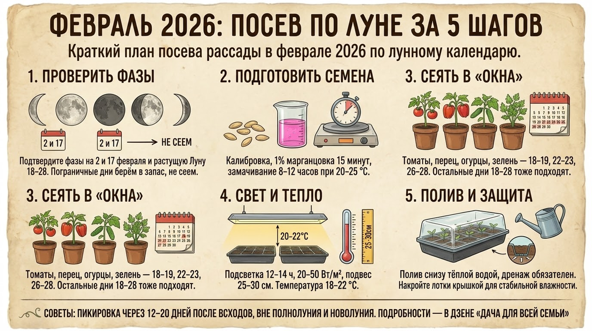 Полезные видео, которые смотрел(а) при проверке и подготовке: https://www.youtube.com/results?search_query=лунный+посевной+календарь+2026 — разбор влияния фаз на посевы, в том числе пояснения по переходным датам; https://www.youtube.com/results?search_query=посев+рассады+февраль — практические ролики по посеву и подсветке в феврале. Описания коротко от меня: первое видео помогает не запутаться с часовыми поясами и показывает, как считать переходы фаз; второе — полезно по технике посева, настройке ламп и предотвращению черной ножки. Советую глянуть оба, чтобы соотнести теорию и практику.