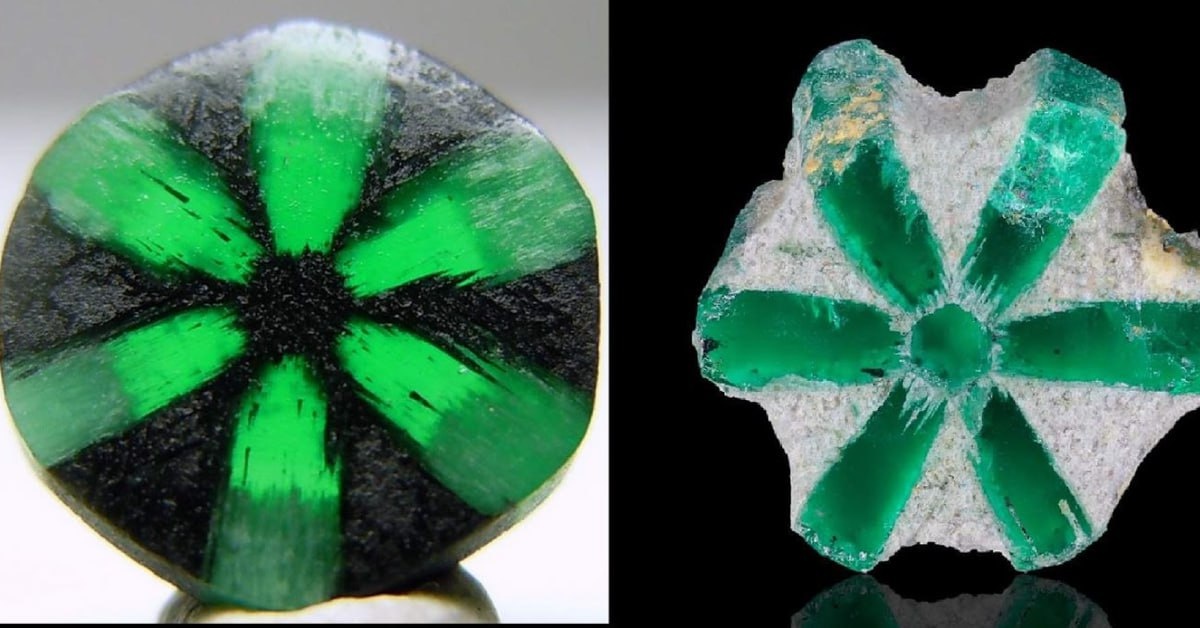 В колумбийских изумрудах иногда формируется шестилучевой рисунок, похожий на шестерёнку. Это не мозаика из кристаллов, а единый кристалл со сложной зональностью роста. Подобные «трапиче» встречаются ещё в сапфирах и рубинах, но именно изумруды стали их символом. Телеграм: https://dzen.ru/id/651983a11cf2387b25169947