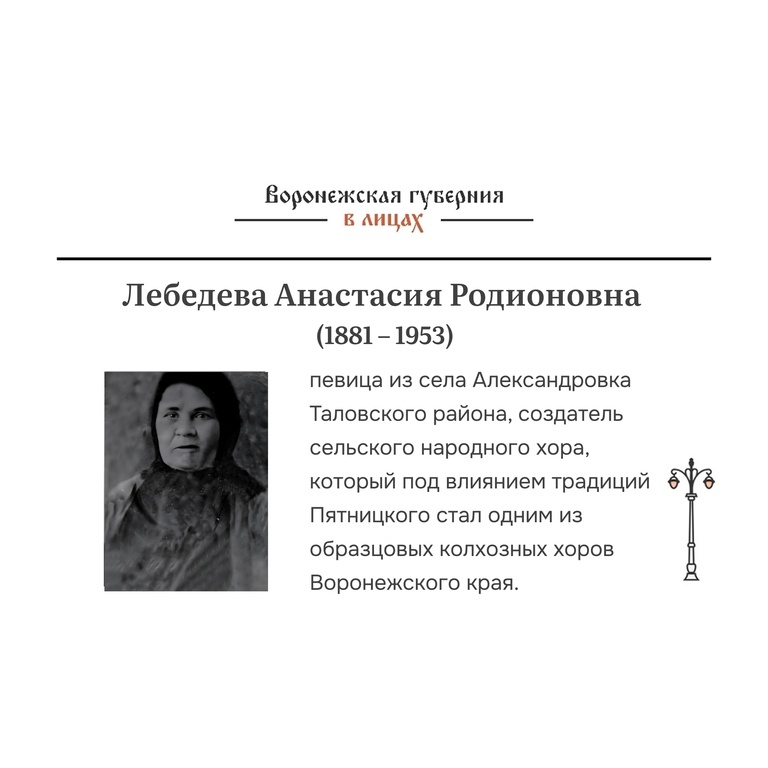 В рамках проектов «Воронежская губерния в лицах. Истории, которые вдохновляют» и «Локально о глобальном» мы продолжаем рассказывать о людях, которые сделали наш край узнаваемым далеко за его пределами. Сегодня наша героиня — Анастасия Родионовна Лебедева (1881–1953), уроженка села Александровка Таловского района, певица и руководитель народного хора. Родившаяся в многодетной крестьянской семье, она с детства впитывала песенную традицию, училась у Арины Колобаевой — одной из ключевых участниц хора Пятницкого. В 1926 году под влиянием М. Е. Пятницкого Лебедева создала в Александровке народный хор, который стал образцом для колхозных хоров всего края. В годы войны Анастасия Родионовна работала с профессиональным хором под руководством К. И. Массалитинова, передавая исполнителям подлинную крестьянскую манеру пения. О ней писали исследователи, а песни, записанные от неё и её хора, вошли в сборник народных песен Воронежской области. Подробнее о жизни и творчестве Анастасии Родионовны Леб