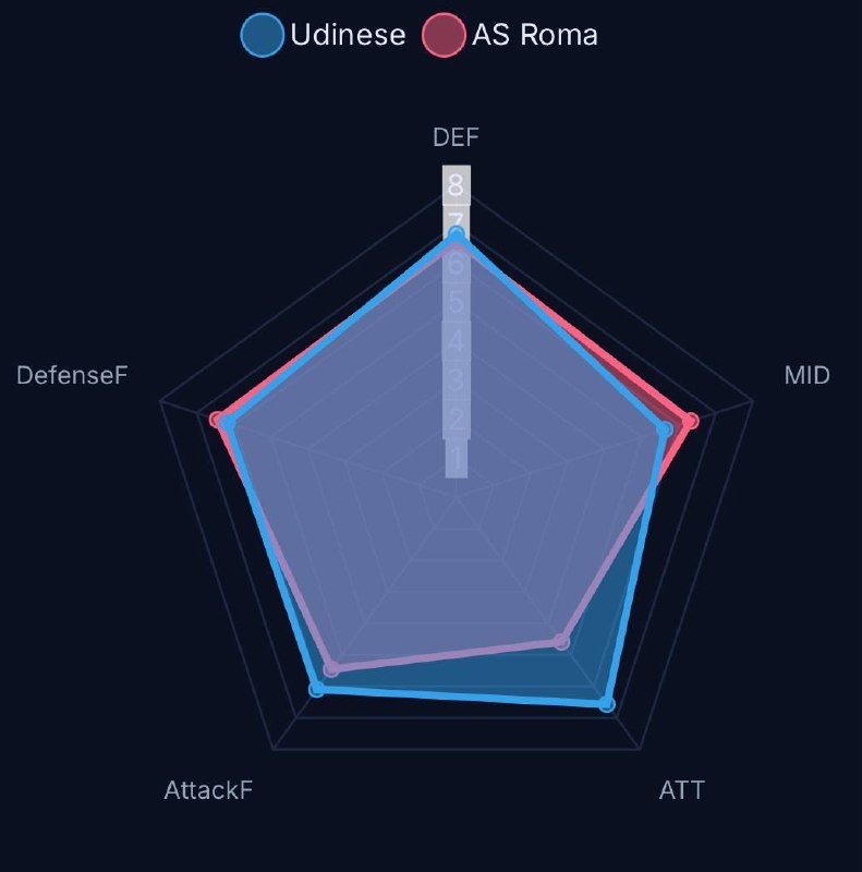 ). В прематче мы ждали, что римляне победят, забью не один гол, но стартовые составы все изменили кардинально. Рома осталась сильна в «игровых» показателях pxf, bql, spi, dpi (определения есть выше) - все в пользу «Ромы». А вот в ожидаемой форме (xF) гости сильно просели, что резко изменило tier матча в пользу «Удинезе». Да, мы не ждали тотального контроля от хозяев, но сценарий вообще был переписан. Редкая штука. О балансе состава гостей речь больше не шла. «Ступеньки вниз» по графику SqB - слабая фигура тренда против «улыбки» у хозяев, где немного проседала только полузащита. В итоге, номинальный аутсайдер забивает случайно и нелепо, но потом наглухо садится в оборону, а его соперник плох, как раз, в финальной трети - самая слабая лиги «Ромы» была именно в атаке. А что она могла сделать с «автобусом» в штрафной? Вопрос риторический. Таким образом, матч заканчивается 1-0, а абсолютно полярном для раннего прематча сценарии. __ Голосуйте за матч дня пятницы! Скоро начнем разбирать