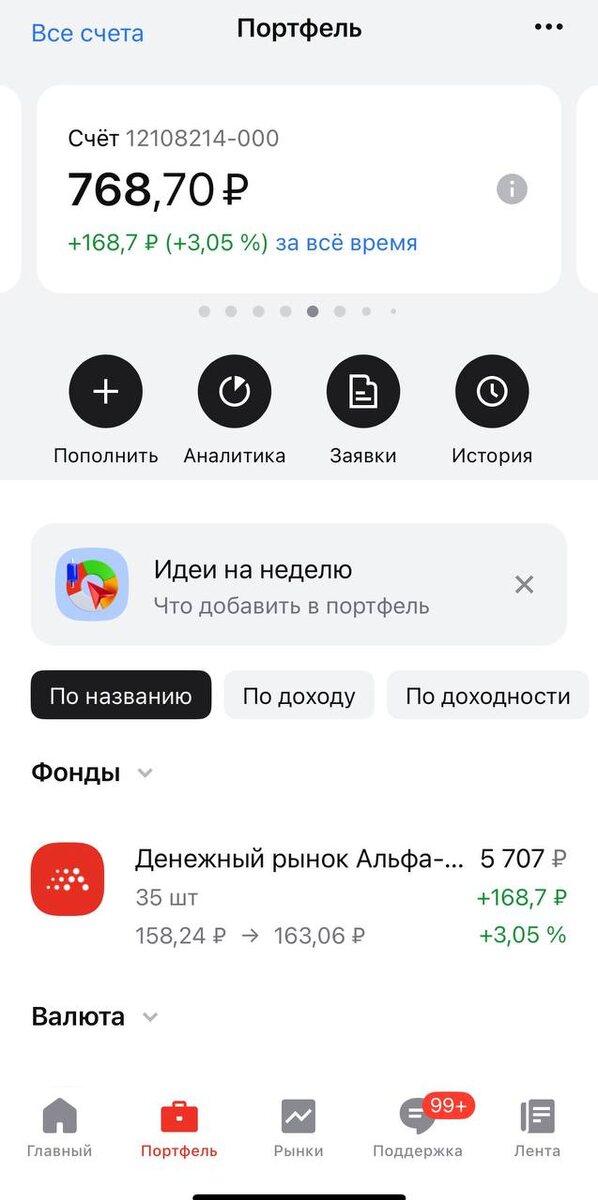 ? Друзья, я когда зашел на аккаунт, я был в шоке, мой прогноз в 150% годовых оказался правдой. Смотрите сами, я вложил 600₽ на 7 счетов в Альфе, и чуть больше чем за 2 месяца каждый счет вырос до 768₽. Считаем: при вложенных 600₽ и доходе 168₽ за два месяца - это дает около 150% годовых. Это конечно не миллионы воротить, но все же капитал можно так потихоньку собирать. Пока есть возможно заработать почему бы и нет. Кстати, сейчас можно получить еще 10000₽ за открытие брокерского счета в Альфе. Кто хочет получить халявные 10000₽ вот ссылка 👉 ссылка на 10к