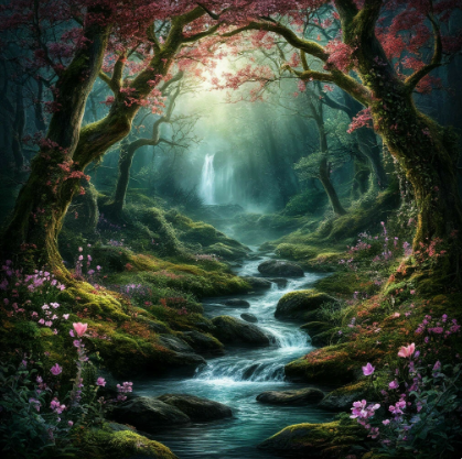 На изображении представлен волшебный лес, наполненный магией и природной красотой. В центре композиции находится большое дерево с изогнутыми ветвями, покрытыми мхом. Его крона украшена яркими розовыми цветами, которые словно светятся изнутри. Под деревом протекает небольшой ручей, вода в котором переливается на солнце, создавая ощущение движения и жизни.