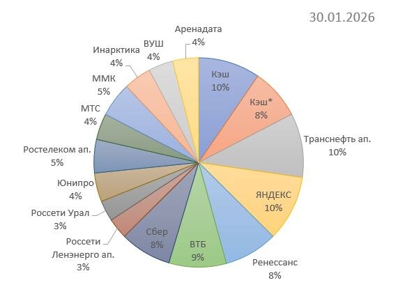 Обзор портфеля - январь 2026 ❌ Лукойл ($LKOH) и ❌ ЮГК ($UGLD) проданы с прибылью, сделки описывались в канале. Текущую структуру портфеля привожу на диаграмме, комментарии ниже. 💵 Кэша 18% (Кэш со звездочкой - это короткие облигации, которые можно конвертировать в кэш). 💡 Добавил МТС ($MTSS) в таком же объеме как и Ростелеком, в расчете на рост под дивиденды. 💡 Добавил Ленэнерго ап ($LSNGP) и Россети Урал ($MRKU) под идею солидной индексации тарифов на электроэнергию и роста дивидендов в 2026-2027 годах. Идею не расписывал в канале, так как сам не разбираюсь в энергетике, но подсмотрел ее у коллег (есть хорошая аналитика, невозможно разбираться самому во всем, иногда ищу идеи таким способом). 🟢 Транснефть ($TRNFP) и 🟢 Яндекс ($YDEX) - топ-позиции, держу. Позиции сокращал в январе, т.к. они переросли целевую долю в 10% от портфеля. 🟡 Ренессанс ($RENI) - жду отчета, есть сомнения. 🟢 ВТБ ($VTBR) - ставка на дивдоходность, наконец котировка ожила, в последние дни хорошо расте