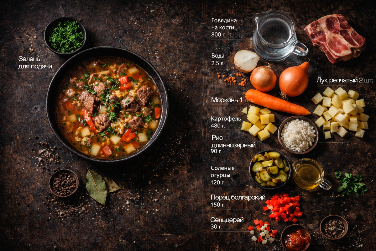 Наваристый суп с насыщенным мясным бульоном, рисом и пикантной кислинкой от соленых огурцов.