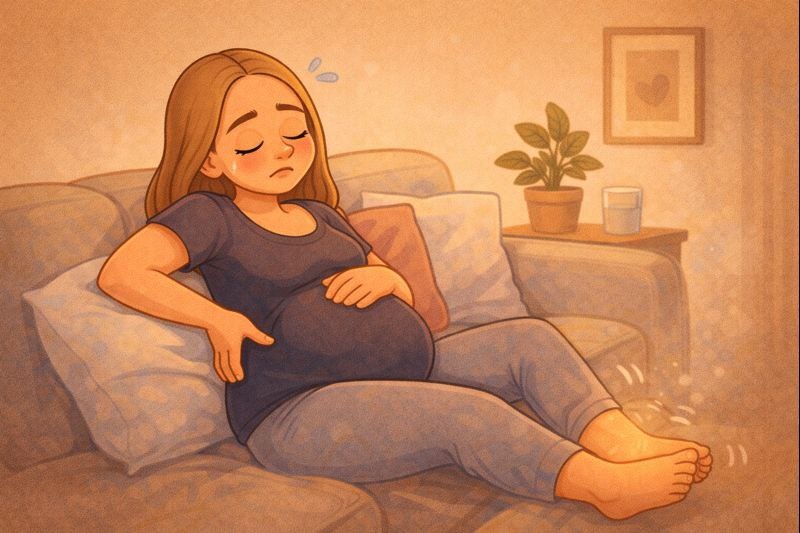 Мама всё чаще чувствует усталость к концу дня 🤍 Живот растёт, и нагрузка на тело увеличивается. Могут появляться отёки или тяжесть в ногах. Важно пить достаточно воды и делать лёгкие прогулки. Сон становится более поверхностным. Поддержка близких сейчас особенно ценна 🌷