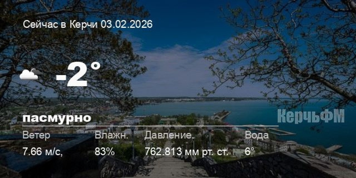 Сегодня днем в Керчи, 03 февраля, ожидается пасмурная погода, температура воздуха от -3.2° до -0.9°С, ветер 7.1 м/с, порывы до 9.66 м/с, давление 765.8 мм рт. ст., влажность 68%. Ближайшей ночью ожидается пасмурная погода, температура -2.3°С. Завтра, 04 февраля, в течение суток ожидается пасмурная погода; ночью -2.3°С, днем -2.3°С, ветер северный 5.1 м/с. - Феодосия от -6.9° до -3.1°С, ☁️ пасмурно, море: 4°C - Судак от -7.4° до -4... подробнее Подписывайся на КерчьФМ.РФ @kerchfm