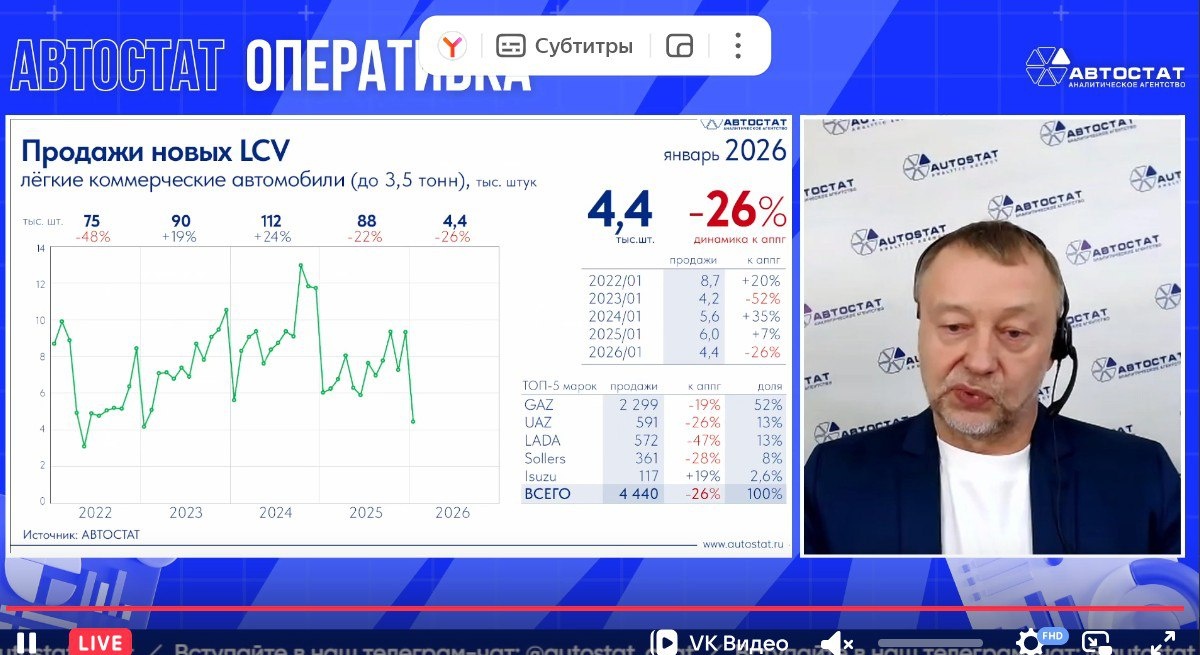 По данным агентства «АВТОСТАТ», в 2025 году в России было куплено 381,1 тыс. легких коммерческих автомобилей (LCV) с пробегом. Это всего лишь на 0,4% меньше, чем в 2024 году. ⚡А вот в январе 2026 - падение составило - минус 26% к январю 2025 (см.слайд) #STARCO #автоновости