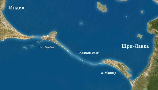 Известен как Адамов мост, Рамасету. Вереница отмелей и островков протяжённостью 48 км в Индийском океане, между Индией и Шри-Ланкой.