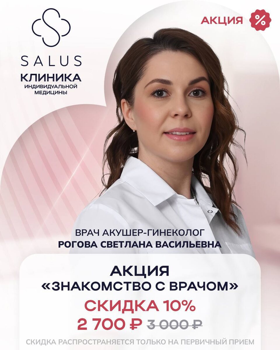 Первичный прием врача акушера-гинеколога Роговой Светланы Васильевны в клинике SALUS со скидкой 10%.