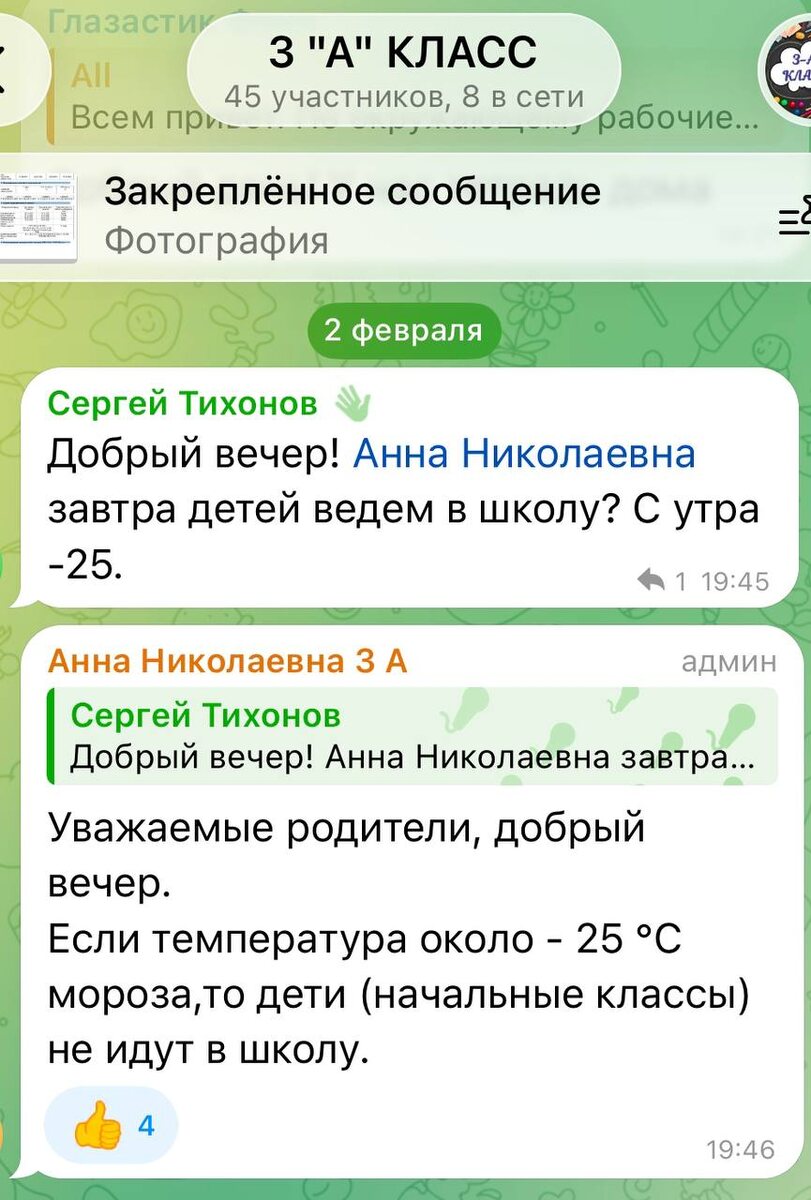 Школа отменялась только при -40С и только если автобус не мог завестись, чтобы нас туда везти. Пару раз такое помню Но беда в том, что в Сибири минус 30-40 это рабочая температура января и февраля, потому как бы вариантов отменять уроки никому в голову не приходило. НН, зумерское время, ленивые дети, которых жалко на самом деле нет и вот это вот всё имеем сейчас. Недавно в НН выпал такой снег, который перекрыл все дороги и подступы и выходы из дома, вот там точно все встало колом. Но в школу все пришли:) чем же мороз мешает одеть валенки и выйти в ночь 😅