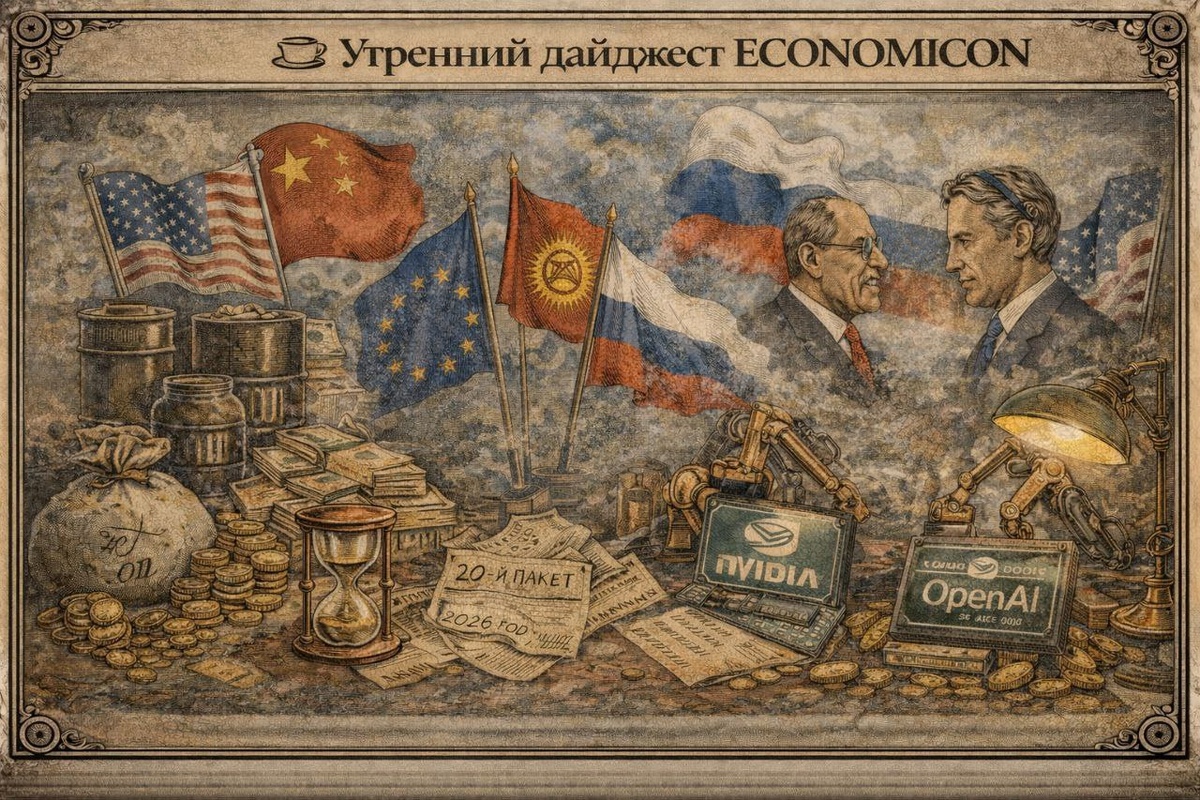! На связи утренний дайджест Economicon 😎 Рынки проснулись. Иллюзии — тоже. 💱 Валюта и сырьё на сегодня $ — ₽77,02 € — ₽91,25 ¥ — ₽11,05 Gold — ~4830 Brent — ~66 🛢 Нефть и реальная политика Китай наращивает закупки иранской нефти. Венесуэлу аккуратно вычеркнули. США отменяют пошлины против Индии за российскую нефть. Ценности — ценностями, но нефть важнее. 🇪🇺 Санкции как ритуал ЕС готовит 20-й пакет санкций против России. Обсуждают ещё и Кыргызстан — «на всякий случай». Количество растёт. Эффект давно перестал измеряться в заметных величинах. 🇷🇺🇺🇸 Диалог без диалога Россия предложила США «устранить разногласия». Формулировка дипломатическая. Результат — как обычно, где-то в будущем времени. 📊 Корпоративная проза Аэрофлот — отчёт и индексация «плоских» тарифов. Северсталь — квартальные цифры. Бизнес живёт. Восторгов не планирует. 🤖 ИИ: много денег, мало понимания Oracle занимает $25 млрд — долг растёт, акции падают. OpenAI недовольна Nvidia, ищет альтернативы. Будущее