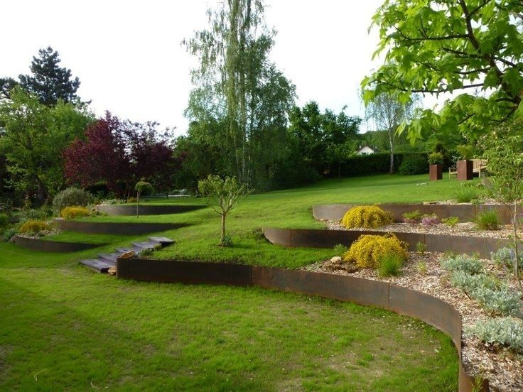 Нижняя терраса: Лужайка, игровая площадка, пруд (естественный сборник воды). - Из чего делать стенки: Габионы (сетки с камнем) выглядят современно и отлично дренируются. Бетонные блоки под камень, обработанная лиственница или дуб для более природного стиля. Важно: Любая подпорная стенка должна иметь дренажную систему (перфорированную трубу в гравийной подушке), иначе её разопрёт водой.
