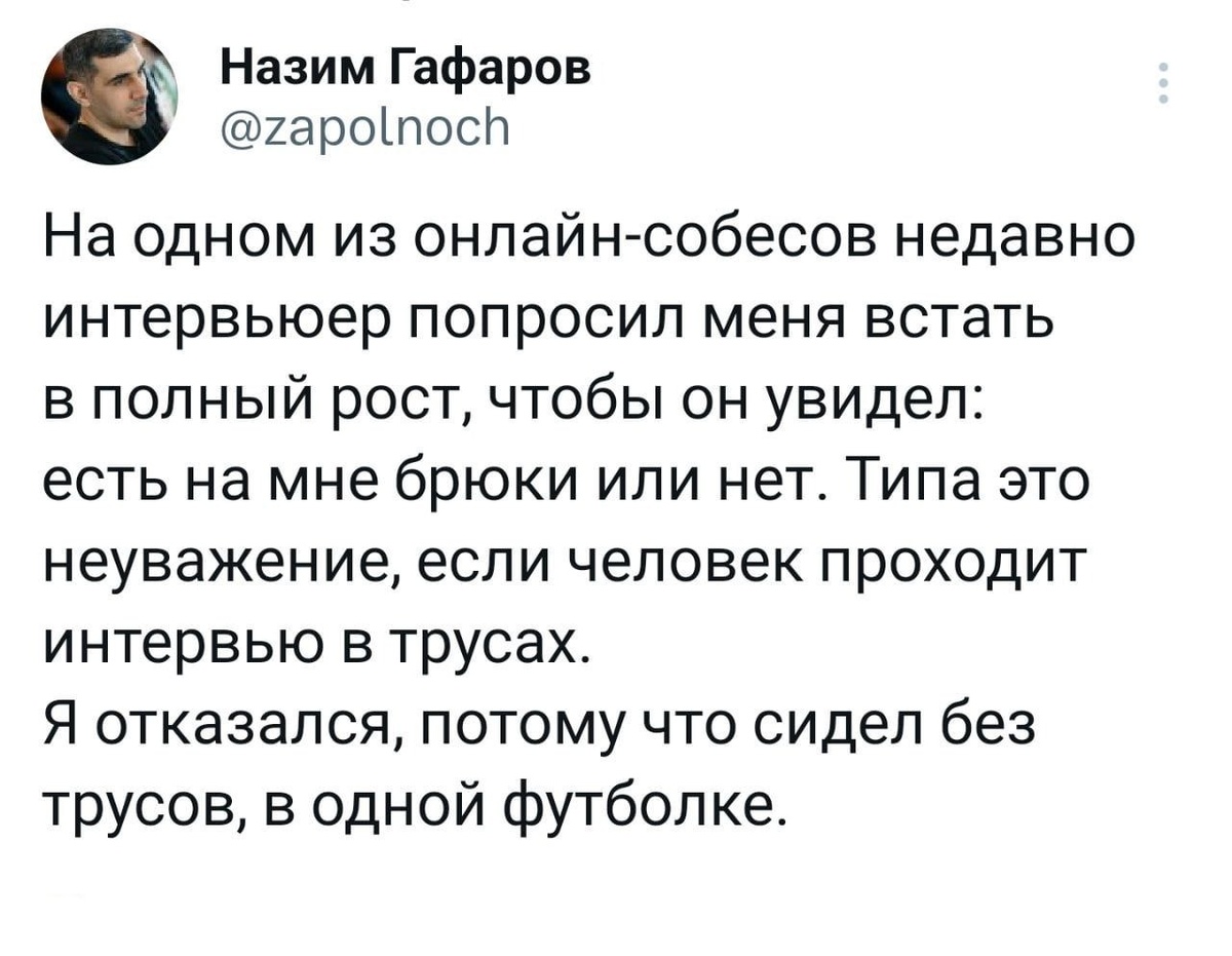 Иногда такой формат удобнее и менее волнителен, чем формат личной встречи, но есть тонкости. Если их знать и соблюдать, то он-лайн собеседование и правда может оказаться более успешным 👌Ставим гаджет на уровне глаз или выше Если интервью через смартфон/планшет, НЕ держим его в руке (картинка дергается) НЕ кладем его на стол - снизу мы выглядем не пропорционально, кудрявые ноздри видны изнутри, глаза маленькие, навыкате и на первом плане - второй подбородок Так играют ракурс и тени, а с нами уже ИГРАТЬ НИКТО НЕ ЗАХОЧЕТ 👌Смотрим в камеру Обычно люди смотрят на свое изображение на экране и пытаются принять выигрышную позу - а у собеседника мы блуждаем взглядом по всему экрану и выглядим, как ПОЛОУМНЫЙ ЕНОТ 👌 Помним, что вы без штанов Конечно можно (и даже нужно, если это добавит нам решимости) прибыть на он-лайн собеседование как в трусах, так и без них, только, главное - не забывать об этом) ведь если нас попросили уточнить номер паспорта, а он в шкафу – мы на автомате встанем и п