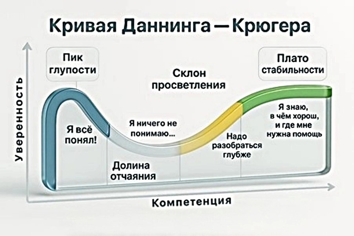 Вы замечали, что самые уверенные в своей правоте люди зачастую знают о теме меньше всего? Формулировка и обоснование данного эффекта приписывается американским социальным психологам Джастину Крюгеру и Дэвиду Даннингу, откуда и получила свое название. Что такое эффект Даннинга — Крюгера? Это когнитивное искажение, при котором люди с низким уровнем компетенции в какой-то области склонны переоценивать свои знания и способности. И наоборот — настоящие эксперты часто страдают от «синдрома самозванца» и недооценивают себя. Почему так происходит? Чтобы понять, насколько ты хорош в чём-то, нужно обладать умением «взглянуть на себя со стороны». А его как раз и нет у новичков. Классический график эффекта: «Пик глупости»: Новичок → ощущает эйфорию от новых знаний. Ему кажется, что он уже всё понял и может учить других. Его уверенность зашкаливает, но на самом деле он почти ничего не знает. «Долина отчаяния» По мере обучения уверенность падает, открывается бездна незнания. Приходит понимани