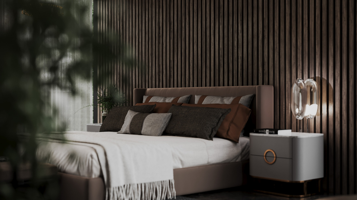 Замечали разницу? В одних интерьерах рейки выглядят естественно — будто стена и мебель родились вместе. В других — ощущение «чужеродного тела»: декор есть, а гармонии нет. Причина не в материале и не в цене. А в том, как рейки связаны с пространством. Мы — производим мебель и рейки — подготовили дизайн-проекты, которые показывают два рабочих подхода. Оба ведут к гармонии. Главное — выбрать правильный под задачу помещения. В спальне и гостиной стена не должна «кричать». Ей достаточно выделить зону — и замолчать. В дизайн-проекте спальни рейки в декоре «Тик небраска» расположены строго за изголовьем. Темная текстура с прожилками создает глубину, но не перетягивает внимание. Кровать остается центром — рейки просто обрамляют ее. То же в гостиной с рейками в декоре «Бронза»: металлический отлив добавляет вес и солидность за ТВ-зоной, но не конкурирует с диваном или креслами. Они «привязывают» технику к стене — и создают ощущение завершенности. Если рейки — акцент, их зона должна быть четко