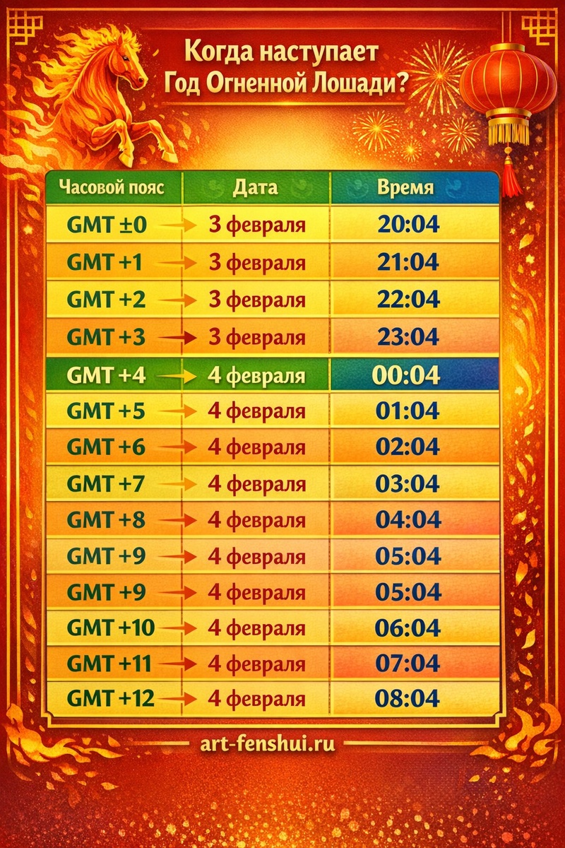 Солнечный год включается в один и тот же момент по всей планете. Просто в разных часовых поясах этот момент выглядит по-разному на часах. Например, если в Пекине (GMT+8) год наступает 4 февраля в 04:04, то в Москве (GMT+3) это будет 3 февраля в 23:04, а где-то в Америке — ещё ранний вечер 3 февраля. Энергия одна и та же, меняются только цифры на часах. Многие люди удивляются, что ощущение «нового года» приходит у них не с праздниками, а чуть раньше — или наоборот, позже. Это нормально. Энергии редко спрашивают, готовы ли мы к календарным датам. Год Огненной Лошади — это время скорости, прямоты, открытых действий и решений без долгих согласований. Он начинает работать не с фейерверков, а с изменения внутреннего ритма и событийного фона. И чем точнее мы понимаем, когда именно включается этот ритм, тем проще в нём ориентироваться.