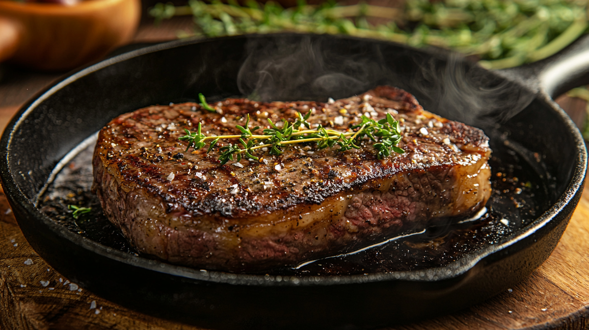 - Обжаривайте стейк 2–3 минуты с каждой стороны, чтобы образовалась золотисто-коричневая корочка. Корочка запечатывает соки внутри и создаёт аппетитный аромат.