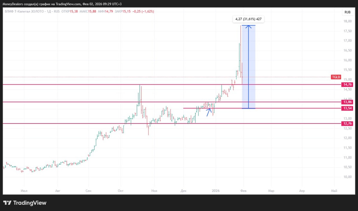 мы видели прибыль 30% меньше чем за месяц! Связано это естественно с ростом золота в основном и плохо, что я только начал набирать позицию. Далее мы увидели сильный рост, больше я пока не докупал. Но от уровней, которые я показал стрелочкой, я буду смотреть как будет вести себя цена и потихонечку буду добирать позицию, чтобы держать её какое-то продолжительное время, пока не посчитаю, что нужно выходить из сделки! (не рекомендация, аналитика)