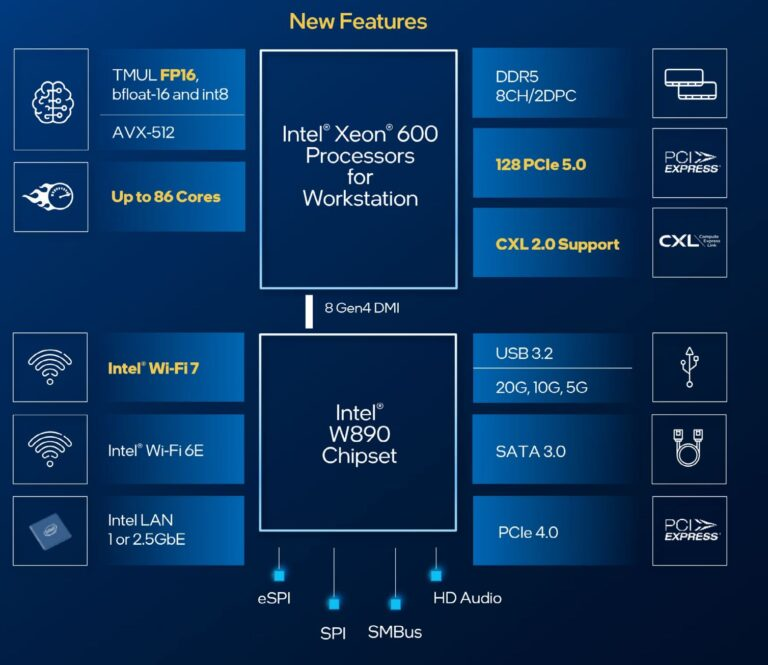 Сегодня Intel анонсировала семейство процессоров Xeon 600 для рабочих станций под кодовым названием Granite Rapids. Эта линейка ориентирована на односокетные системы с большим количеством ядер. Компания также уделяет особое внимание высокой скорости ввода-вывода для многопроцессорных систем и хранилищ данных. Флагманским процессором, указанным в списке является чип Xeon 698X. Intel заявляет о 86 ядрах и 172 потоках. Общий объем кэша составляет 336 МБ L3, а базовая тактовая частота — 2,0 ГГц. Intel заявляет о разгоне до 4,8 ГГц в режиме Turbo Boost Max 3.0 и до 4,6 ГГц с Turbo Boost 2.0. Intel подтверждает, что этот процессор также имеет разблокировку для разгона. Изображение: Intel Что касается платформы, то Intel использует процессоры Xeon 600 для рабочих станций в паре с чипсетом Intel W890. Компания указывает до 128 линий PCIe 5.0, подключенных к процессору, и 8 каналов памяти, DDR5-6400 RDIMM, а также емкость до 4 ТБ. По сравнению с процессорами Xeon WS предыдущего поколения, Grani