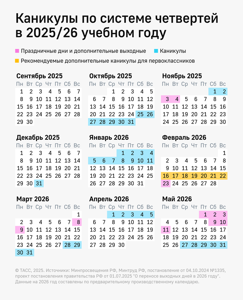 Министр просвещения России Сергей Кравцов сообщил, что школам рекомендовано провести весенние каникулы с 28 марта по 5 апреля 2026 года. Об этом пишет РИА Новости. «Общеобразовательным организациям рекомендуется провести весенние каникулы в период с 28 марта по 5 апреля 2026 года», — сказал он. Так летние каникулы у школьников продлятся с 27 мая по 31 августа. Ранее зимние каникулы проходили с 31 декабря 2025 года по 11 января 2026 года. Кроме того, Минпросвещения рекомендует предусмотреть дополнительные каникулы для первоклассников с 16 по 22 февраля. Фото: Минпросвещения РФ/ Минтруд РФ.