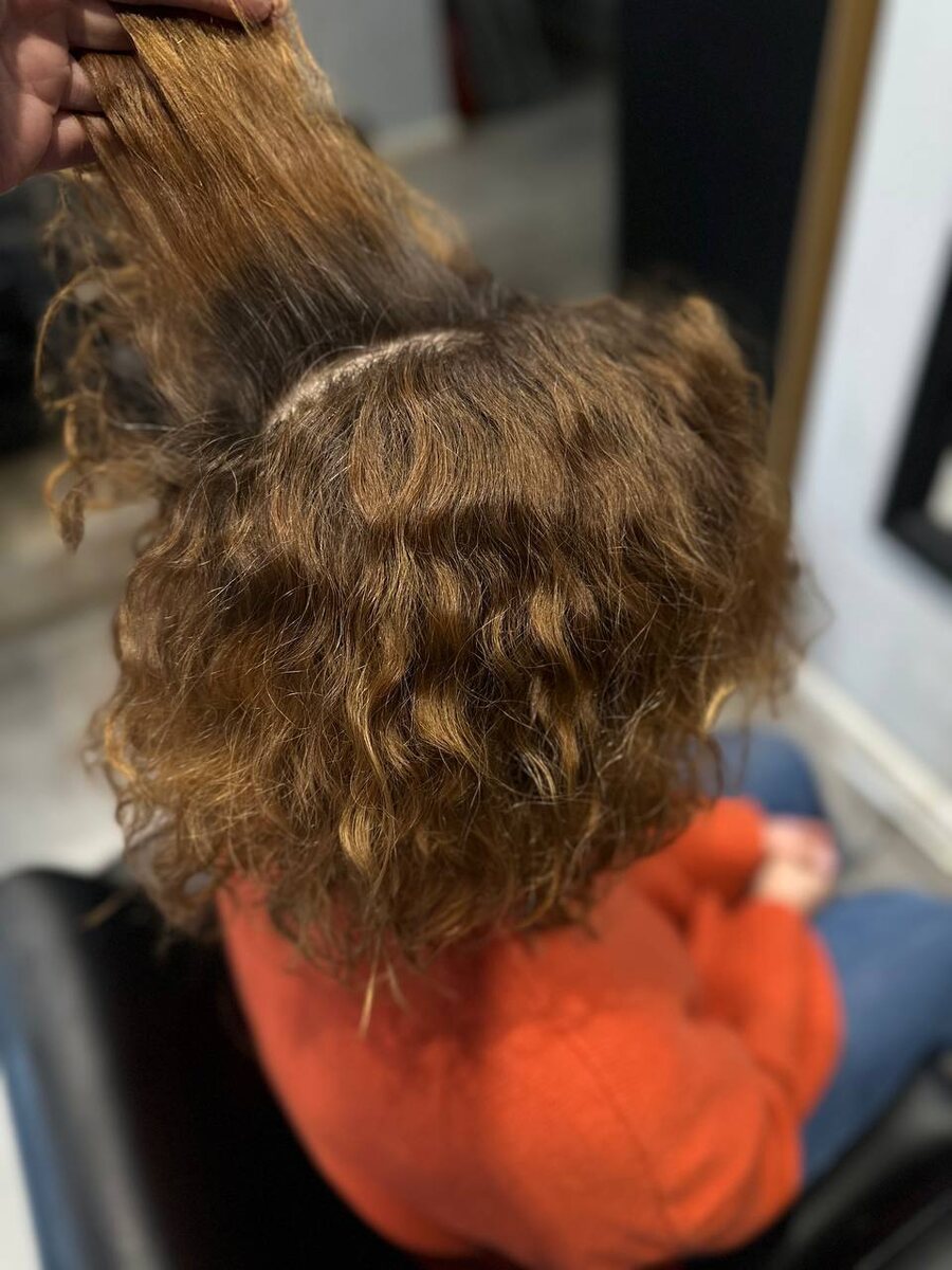 Как Вам наша работа? Яркий медный - частый запрос мастеров. И так давайте разберем подробнее как мы работали и почему выбирали именно эти оттенки. 1. Мы провели диагностику , которая включала в себя опрос клиента по желаемому цвету и возможности волос по качеству структуры. Так как у каждого человека свое восприятие цвета, то для понимания его желания мы показали палитру , где клиент «ткнул» нам пальцем на оттенок 8.44, дополнив что можно чуть плотнее, но яркость необходимо оставить. 2. Проанализировав структуру волоса , натуральную и косметическую базу , мы пряли решение о выборе оттенков и % перекиси водорода. На фото видно, что УГТ НБ на 6 уровне, а полотно имеет 34 направление на разном угт. 3. Тк НБ на 6 УГТ , а желание между 7 и 8 угт, мы понимаем , что нам нужно подняться на 2 угт, но волос тонкий и нам нужно сохранить яркость при этом плотность оттенка, следовательно мы выбираем не 6% оксид , а смесь 6%+ 9% Выбор оттенков обусловлен желанием цвета и понимаем ФО , структ