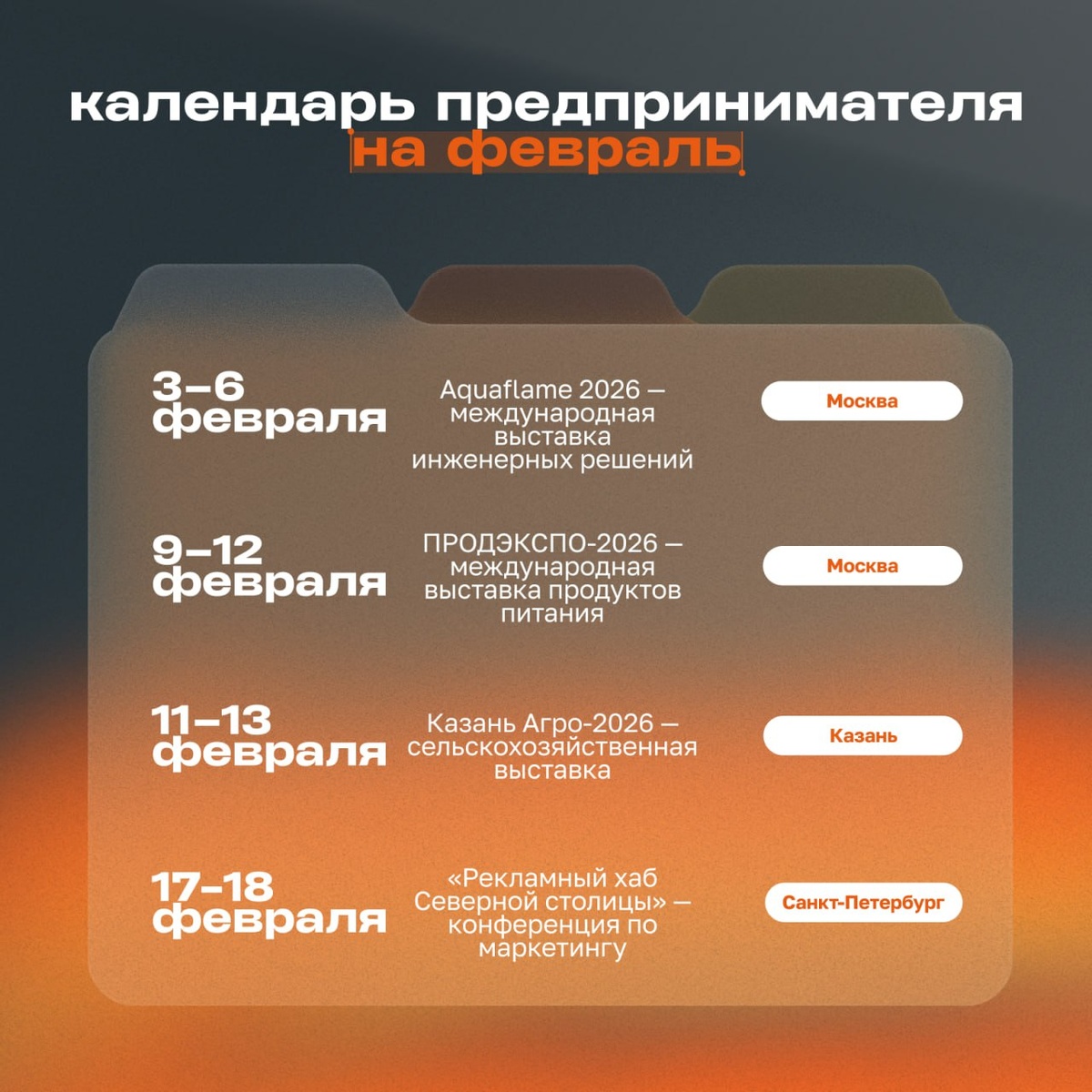 Февраль — активный старт делового сезона: отраслевые выставки, региональные события и практические встречи для предпринимателей, управленцев и команд в разных городах России ⭐️ Aquaflame 2026 — международная выставка инженерных решений 3–6 февраля 2026 года 🔻Москва | Офлайн Крупнейшая отраслевая площадка в сфере отопления, водоснабжения и инженерных систем. В программе — деловые сессии, B2B-переговоры, демонстрация решений и встречи с поставщиками и производителями ⭐️ ПРОДЭКСПО-2026 — международная выставка продуктов питания 9–12 февраля 2026 года 🔻Москва | Офлайн Ключевое событие для производителей, поставщиков, ритейла и HoReCa. Переговоры, контракты, тренды FMCG и новые форматы взаимодействия с рынком ⭐️ Казань Агро-2026 — сельскохозяйственная выставка 11–13 февраля 2026 года 🔻Казань | Офлайн Выставка достижений АПК с деловой программой: технологии, цифровые решения, развитие агробизнеса и диалог с ключевыми игроками отрасли ⭐️ «Рекламный хаб Северной столицы» — конференция п