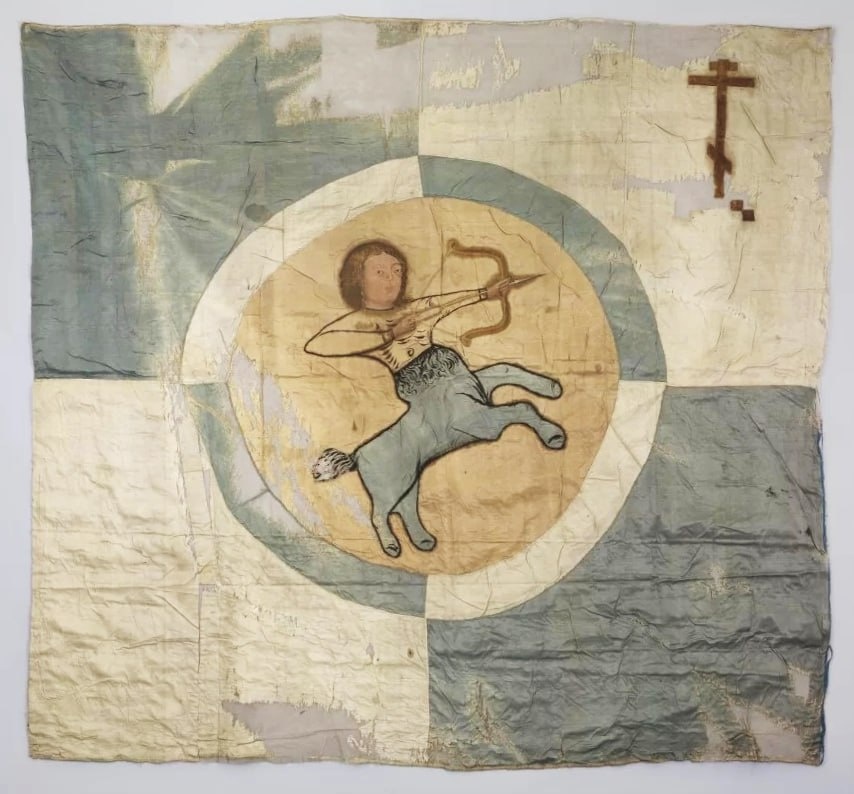 ! Кентавр - стрелец. Знамя роты солдатского полка. XVII в. ММК Кентавры, согласно средневековым преданиям, умело обращаются с луком. Один из них погиб в Троянской войне, и в честь его подвига эллинские "звездословцы" назвали созвездие Стрельца - на древнерусских зодиакальных кругах оно представленно именно кентавром, в редких случаях - со змеиным хвостом