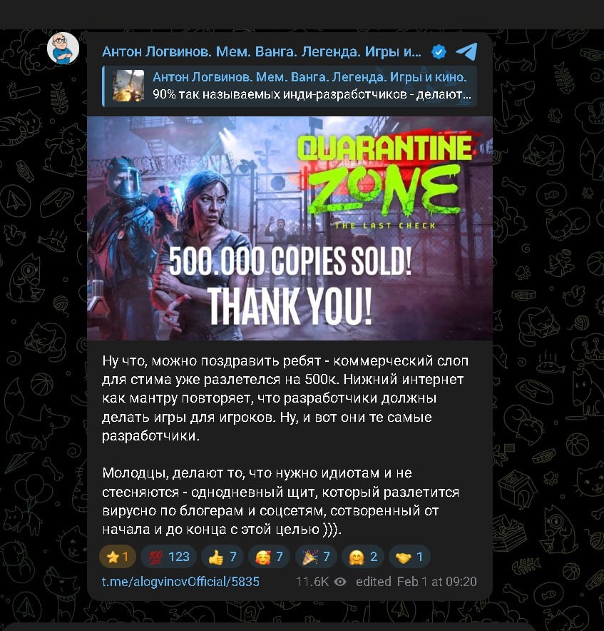 А тем временем Quarantine Zone от российских разработчиков может похвастаться тиражом в 750 тысяч копий. С чем их и поздравил издатель Devolver Digital.
