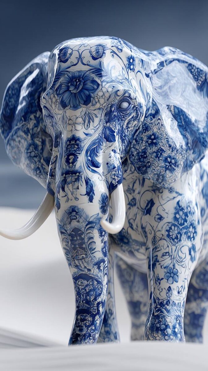 hyperrealistic majestic elephant stands, powerful and wise, with intricate blue and white Gzhel porcelain patterns covering its body and