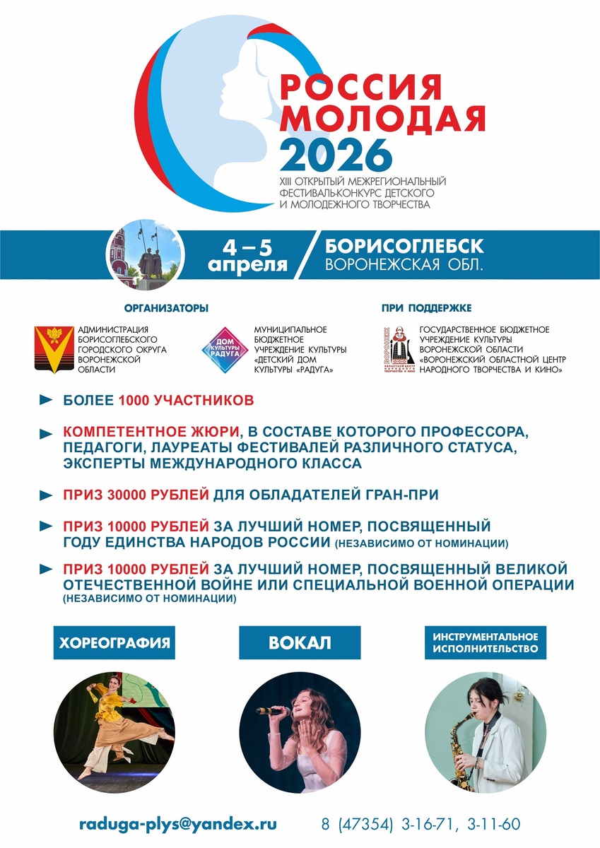 4 и 5 апреля Борисоглебск станет площадкой для одного из самых масштабных творческих событий региона — XIII Открытого межрегионального фестиваля-конкурса детского и молодежного творчества «Россия молодая». Организаторами конкурса выступают администрация Борисоглебского городского округа и Детский дом культуры «Радуга» при поддержке Воронежского областного центра народного творчества и кино. По предварительным прогнозам, фестиваль соберет более тысячи участников из разных регионов страны. Конкурсные выступления пройдут по трем основным направлениям: — Хореография; — Вокал; — Инструментальное исполнение. Оценивать мастерство участников будет профессиональное жюри, в состав которого вошли профессора, педагоги и эксперты международного класса. В 2026 году для победителей предусмотрены специальные денежные выплаты: • 30 000 рублей — обладателю Гран-при фестиваля; • 10 000 рублей — за лучший номер, посвященный Году единства народов России; • 10 000 рублей — за лучший номер, посвящённый