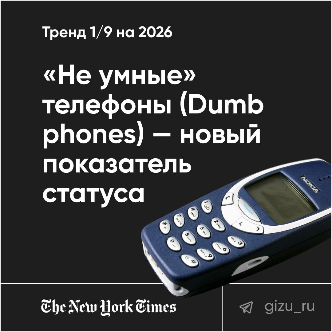 📵 [Тренд 1/9: Серия Трендвотчинг 2026] Тут я полностью согласен с NYT: смартфоны захватили нас настолько, что практически полностью управляют вниманием и держат людей на онлайн-поводке. Быть не в онлайне станет привилегией по-настоящему состоявшихся, а значит успешных людей. Привет, раскладушки и Нокия 3310. Это подтверждает и исследование Техасского университета (McCombs School), где описывается эффект «Слива когнитивных ресурсов»: даже если смартфон просто лежит рядом на столе экраном вниз, он «отъедает» часть «оперативной памяти» мозга. Вы становитесь рассеяннее, просто находясь рядом с ним. А всё потому, что смартфон эксплуатирует базовый дофаминовый механизм человека. Доктор наук Анна Лембке в книге «Дофаминовая нация» хорошо это объясняет: смартфон — это «игла» для непрерывной поставки дешевого дофамина. Листая ленту, мы искусственно задираем уровень удовольствия, после чего неизбежно падаем в «дофаминовую яму» (тревога, скука, апатия – знакомы?). Кнопочный телефон физически