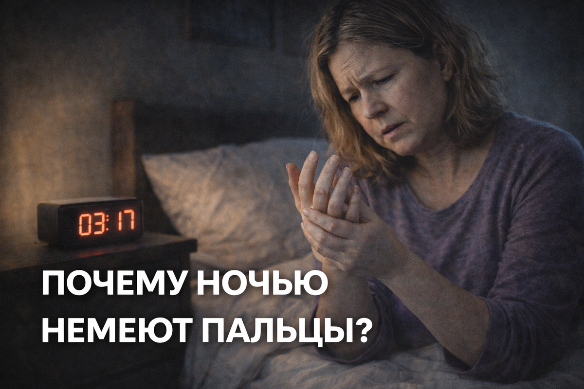 Многие просыпаются ночью от странного ощущения: пальцы рук как будто «отключились». Онемение, покалывание, ощущение ватных или чужих рук. Иногда нужно встряхнуть кисти, растереть пальцы, чтобы всё прошло. Чаще всего это списывают на неудобную позу или «отлежал руку». Но если онемение повторяется регулярно, особенно после 40–45 лет, это почти всегда сигнал организма, а не случайность. Разберёмся, почему ночью немеют пальцы и когда это становится опасно. Во сне нервная система и сосуды должны работать стабильно: Разовое онемение возможно. Регулярное — нет. Одна из самых частых причин — проблемы с шейным отделом позвоночника. С возрастом: Во сне, особенно при неправильной подушке, происходит сдавливание нервных корешков. В результате немеют пальцы, чаще большой, указательный и средний. Очень распространённая причина, особенно у людей, работающих руками или за компьютером. При этом: Синдром развивается медленно и долго остаётся без внимания. С возрастом сосуды теряют эластичность, а мелкие