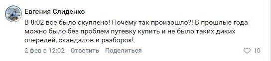Самарские родители, планировавшие организовать отдых своих детей в оздоровительно лагере «Волжский Артек», высказывают возмущение в соцсетях в связи с тем, как было организовано распределение путевок. Утром 2 февраля они выстроились в огромную очередь у входа в учреждение. Но получить заветный документ, дающий право устроить в лагерь ребенка, смогли получить далеко не все. Возмущенные самарцы атаковали аккаунт учреждения гневными сообщениями: «В 8:02 все было скуплено! Почему так произошло?! В прошлые года можно было без проблем путевку купить и не было таких диких очередей, скандалов и разборок!», - написал один из претендентов на путевку. Директор лагеря Галина Цецулина дала разъяснения, что из 1408 мест 720 - распределены по квотам. На свободную продажу поступило 608 путевок, но 252 уже были забронированы организациями. В областном Минобразования намерены разработать рекомендации лагерю по изменению организации процесса, так как родители опасаются, что путевки могут стать предметом