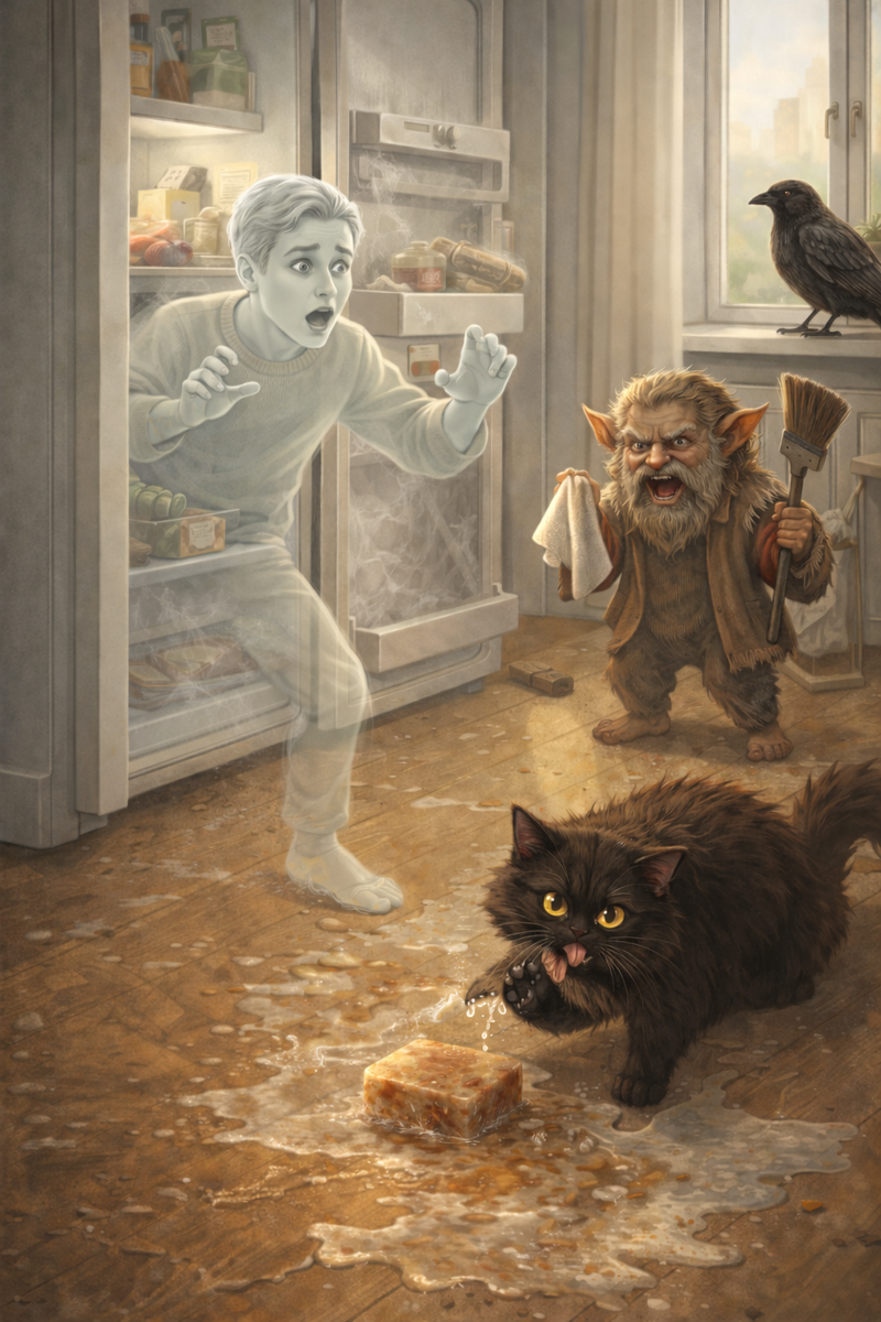Он подобрал квадрат супа (он весь аж скукожился в один сплошной комок негодования), бережно уложил его обратно в морозилку, поправил все пакеты вокруг и закрыл дверцу с таким щелчком, который звучал как приговор. Потом ещё полчаса вытирал след от проехавшего супа и ворчал про «протоколы», «точку росы» и «безответственных эфирных существ».
