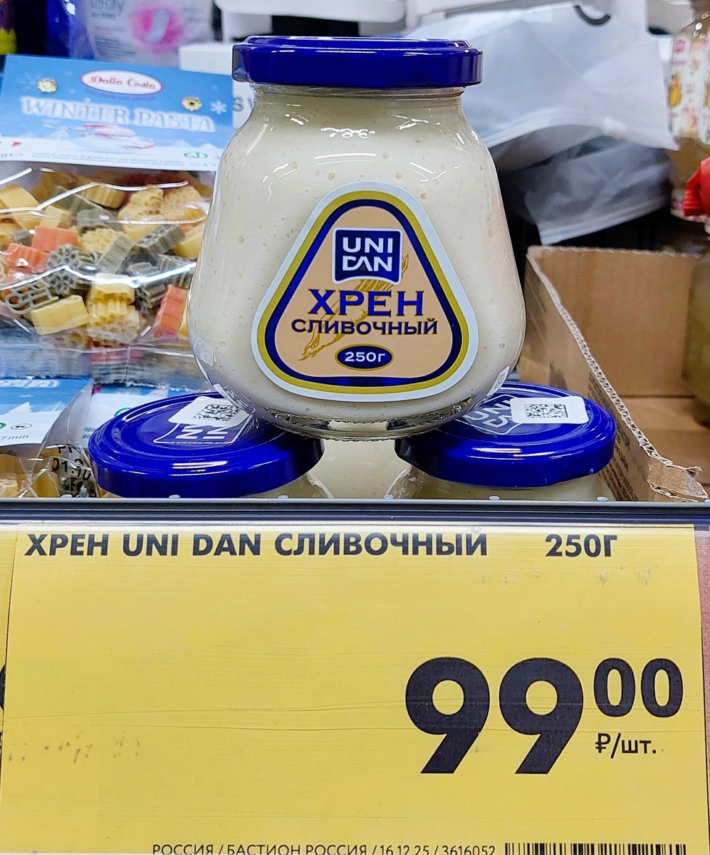Впервые встречаю на полках нашего Чижика такую продуктовую новинку: Хрен Сливочный Uni Dan - это кремообразный соус белого цвета умеренной остроты, сочетает сливочный вкус с лёгкой остротой хрена. Подходит для приготовления различных блюд, добавляет остроты и аромата. Вес 250г по цене 99 рублей.