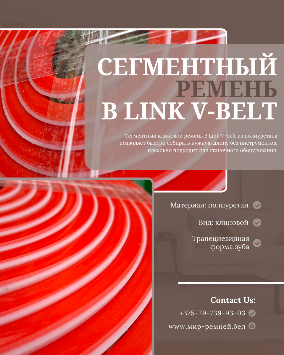 На токарных, фрезерных, сверлильных станках, пилах, шлифовках, насосах или компрессорах ремень — слабое звено. Рвётся в самый неподходящий момент, требует полной разборки привода, снятия шкивов, часов простоя. Замена — и снова ждёшь нужный размер, платишь за каждый отдельный ремень, а потом он растрескивается от масла, жары или холода. Знакомо? Это классика для оборудования с профилем B (17 мм ширина, 11–13 мм высота). Революционное решение: сегментный полиуретановый ремень B Link V-belt — собирается как конструктор Lego, без инструментов и без разборки станка. В «Мир ремней» мы поставляем и производим эти ремни в Минске. Это не просто замена — это система, которая меняет подход к обслуживанию приводов. Что делает B Link настоящим прорывом 🔹 Сборка за 5–10 минут: звенья защёлкиваются вручную — отрезаете нужную длину, соединяете, надеваете на шкивы. Нет нужды снимать двигатель или шкивы.