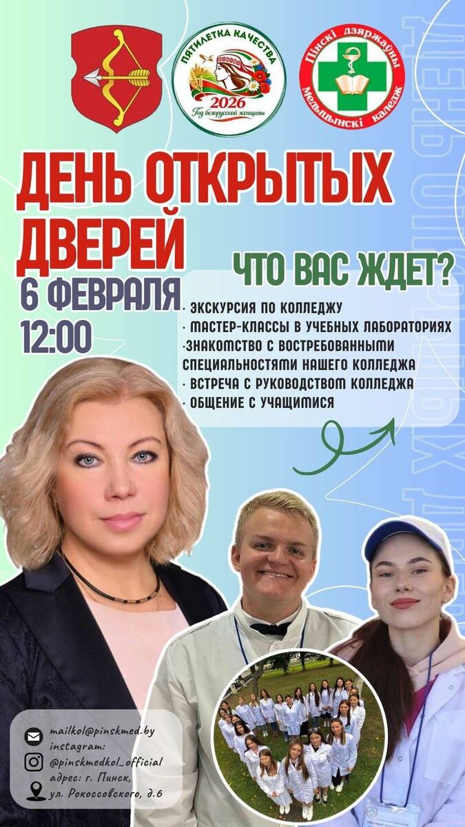 6 февраля 2026 года в 12:00 Пинский государственный медицинский колледж приглашает вас на День открытых дверей! Что вас ждет? 🔹Экскурсия по колледжу 🔹Мастер-классы в учебных лабораториях 🔹Знакомство с востребованными специальностями нашего колледжа 🔹Встреча с руководством колледжа 🔹Общение с учащимися Вы сможете: ✔️Увидеть работу симуляционных манекенов на практике ✔️Поучаствовать в медицинских манипуляциях ✔️Задать все интересующие вопросы Будет интересно! Приходите сами и приводите друзей! ✨Ждем вас по адресу: ул. Рокоссовского, д. 6, г. Пинск. 6 февраля 2026 года (пятница), начало в 12.00 @Пинский Вестник 📱Ютуб 📱ВК 📱ИНСТАГРАМ 📱ОК 📱ФЕЙСБУК 📱ТИК ТОК Прислать новость