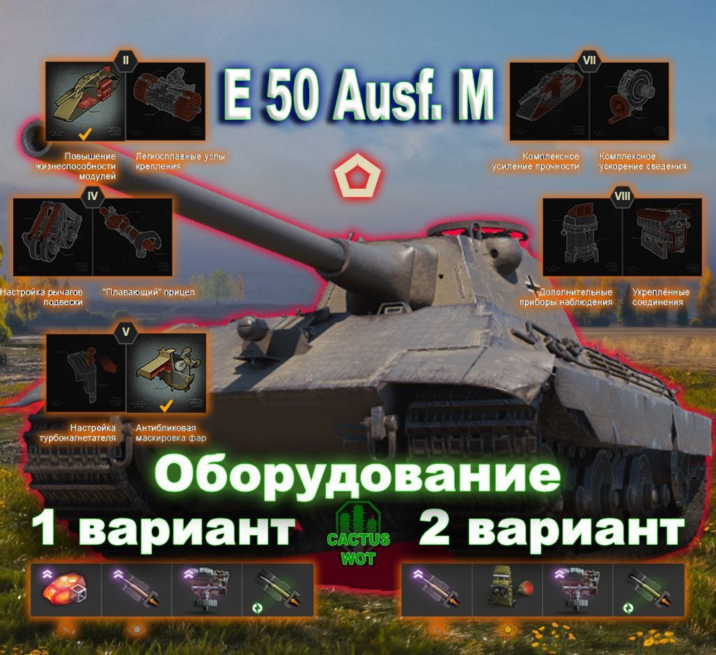 M полевая модернизация и оборудование... 🏥Средний танк штурмовой 10 уровень. Германия. 🔼Полевая модернизация на картинке🔼 ТТХ: Калибр (мм)105 Урон (ед.)390 / 390 / 510 Бронепробиваемость (мм)270 / 330 / 60 Скорострельность орудия (выстр/мин)6.25 Заряжание орудия (с)9.60 Скорость гориз. перевода прицела (град/с)30 Углы поворота башни (град)180 / 180 Углы вертикальной наводки (град)-8 / 20 Время сведения (с)2.10 Разброс на 100 м (м)0.30 Средний урон в минуту (ед/мин)2437.50 Боекомплект (шт.)48 Прочность (ед.)2050 Бронирование корпуса (лоб/борт/корма в мм)150 / 80 / 80 Бронирование башни (лоб/борт/корма в мм)250 / 80 / 80 Время ремонта ходовой (с)12.03 Масса (кг)62310 Мощность двигателя (л. с.)1200 Удельная мощность (л. с./т)14.16 Макс. скорость / задний ход (км/ч)60 / 20 Скорость поворота шасси (град/с)44 Незаметность: Неподвижной машины (%)0.17 В движении (%)0.13 Наблюдение: Обзор (м)400 Дальность связи (м)720 ➕Плюсы: точное орудие; хорошие динамические характеристики; высока